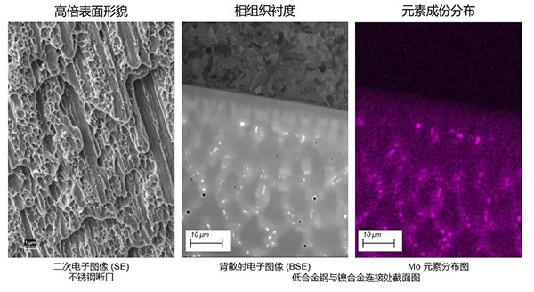 扫描电子显微镜相比于光学显微镜特有的三种成像方式为:高倍表面形貌、相组织衬度以及元素成份分布。高倍表面形貌具有分辨率高,景深大等特点,尤其适合观察断口的微观形貌特征,来区分断口的断裂模式是韧性断裂还是脆性断裂,而相组织衬度则尤其适合于查找金属中非金属夹杂物,再辅助于能谱的分析结果来判断其为何种材料。